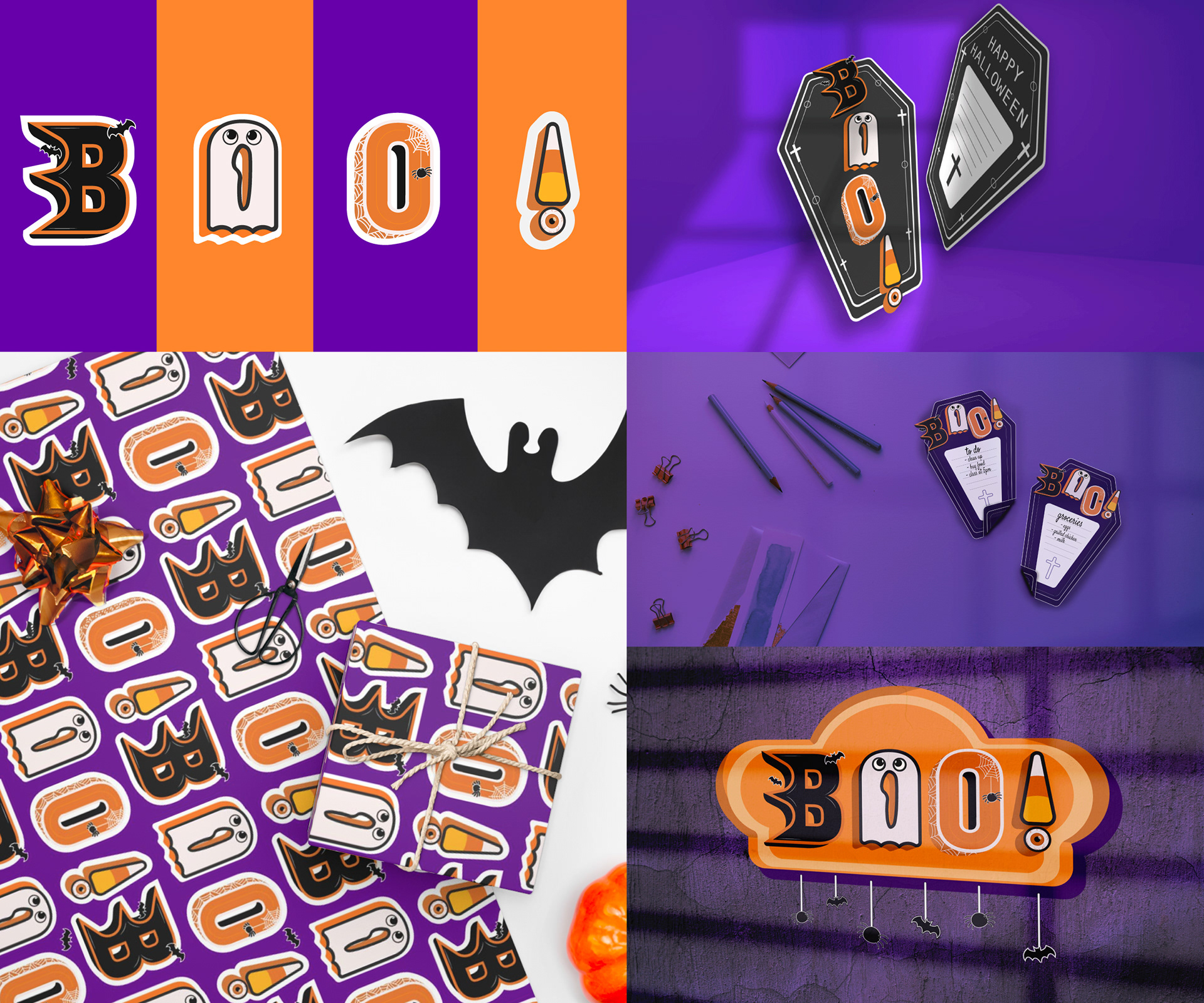 'Boo!' was developed for my Typography class with the objective of creating a drop-cap based spread of collateral. Featured are a pattern (top left), wrapping paper (bottom left), holiday card (top right), sticky notes (middle right), and a hanging sign (bottom right).