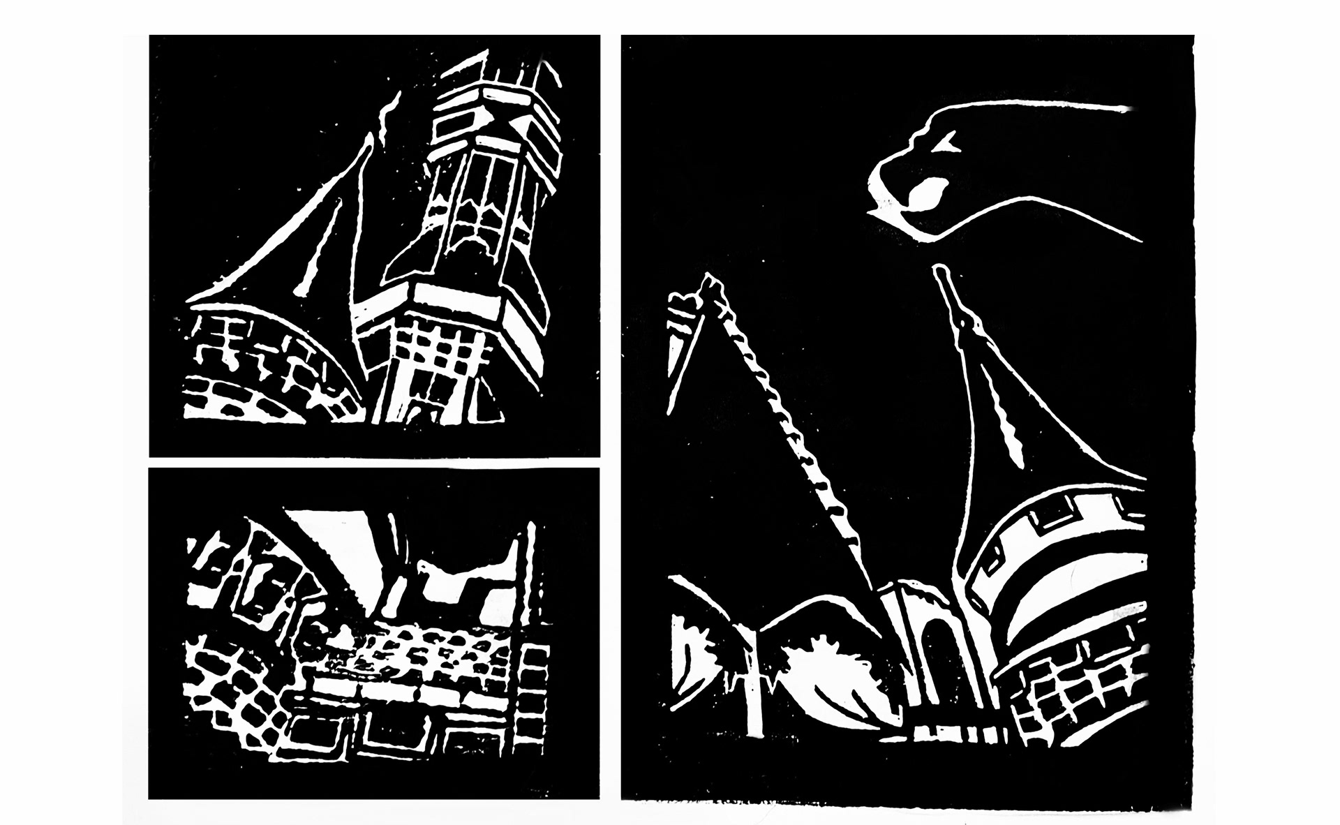 'Castle Crashers' is a triptych piece developed for my Printmaking class. My goal was to print a solid set of pieces that created a mystical, engaging scene with intriguing angles and forms. I then created apparel based off of the prints/other similar prints.