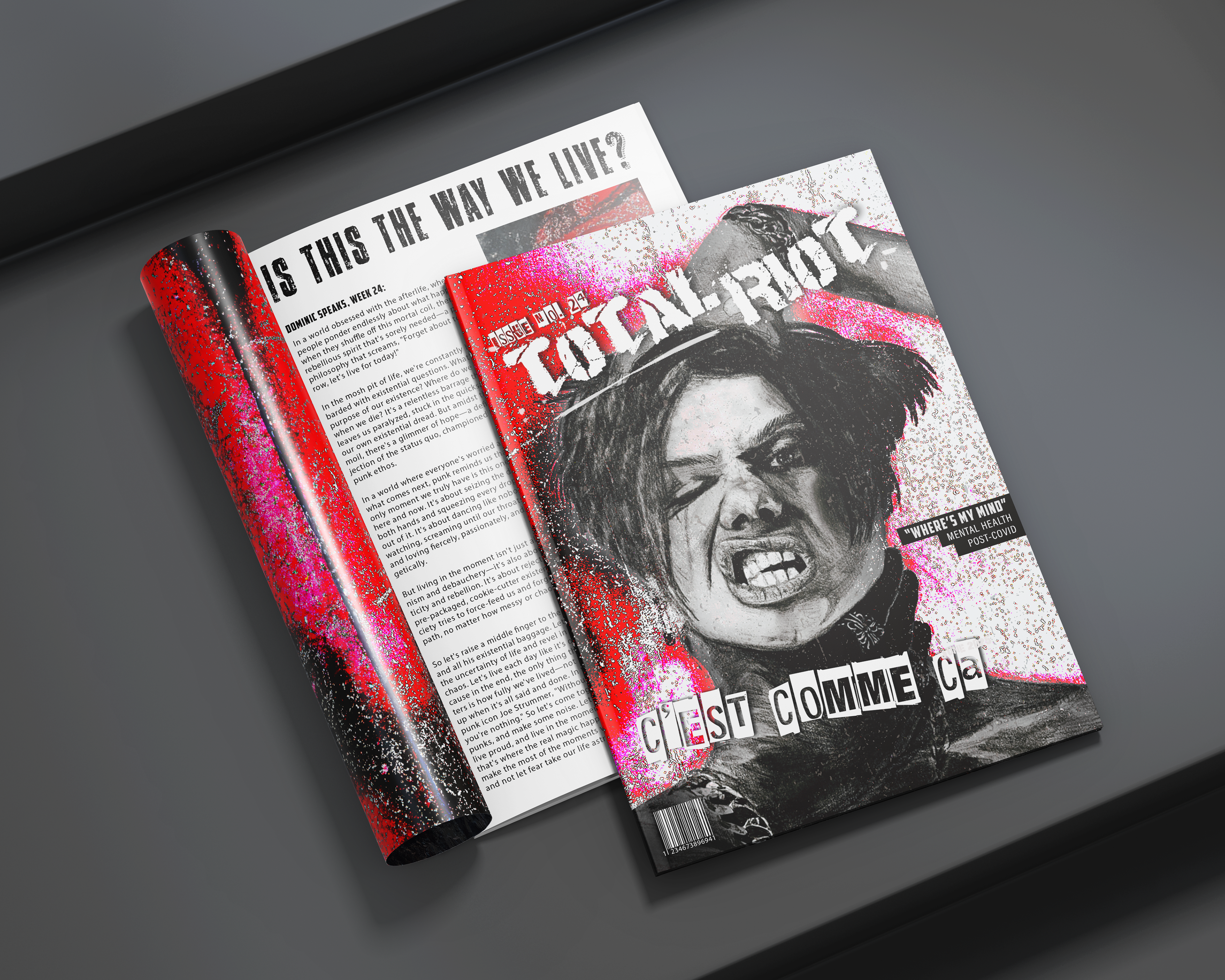 This piece was a personal project to practice magazine layout/mockup design. The fictional magazine 'Total Riot' is meant to haveĀ a modern punk theme.